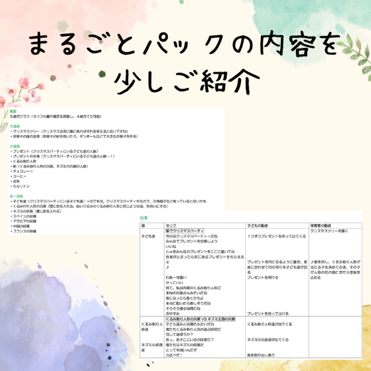 この【発表会「くるみわり人形」まるごとパック】PDFでは、4歳児クラス、5歳児クラス向けにくるみわり人形の発表会がすぐにできる内容をまとめています。