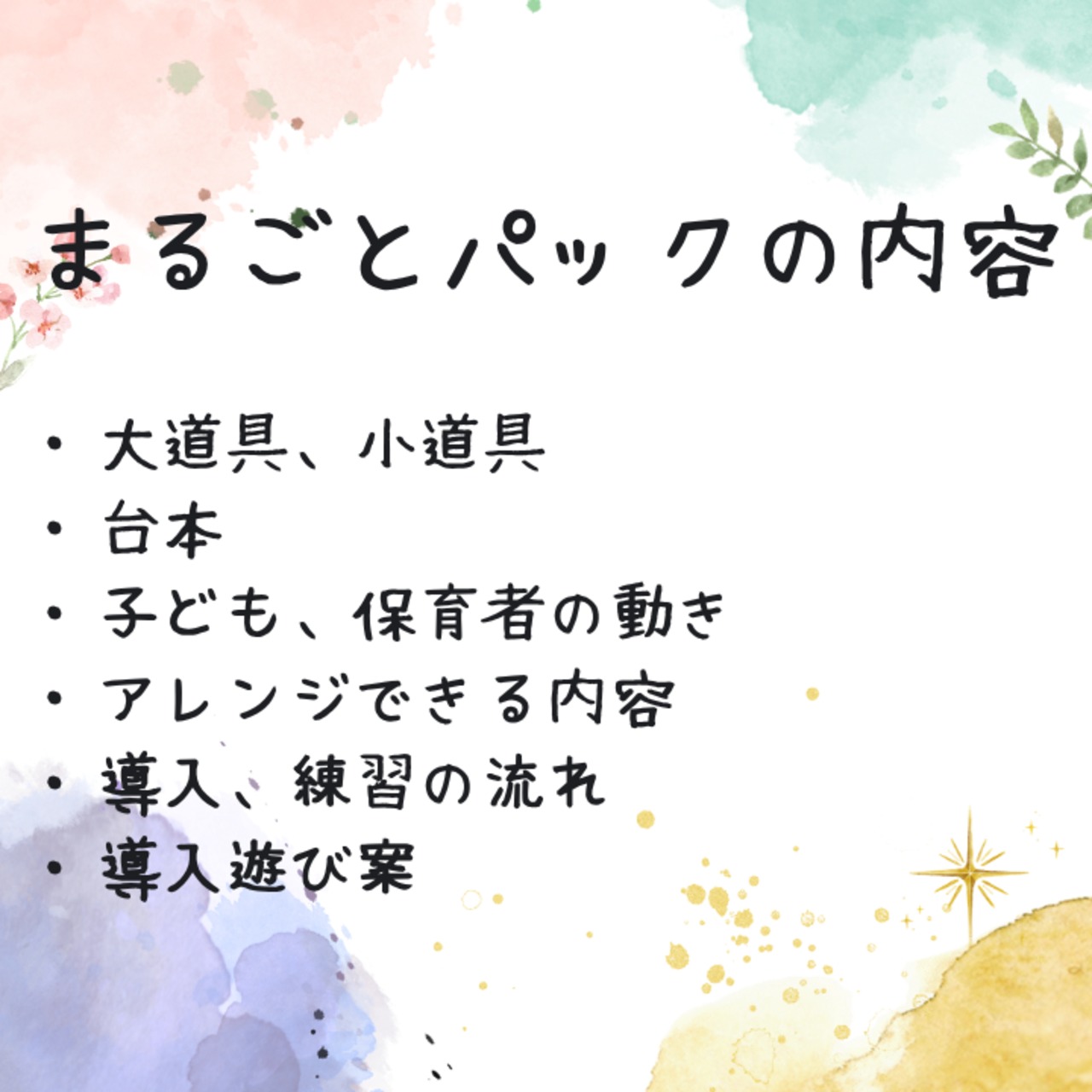 (発表会まるごとパックとは、台本だけでなく大道具・小道具・導入遊び、アレンジ案までそろった、すぐに使える発表会サポート集です)