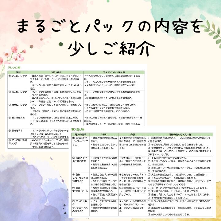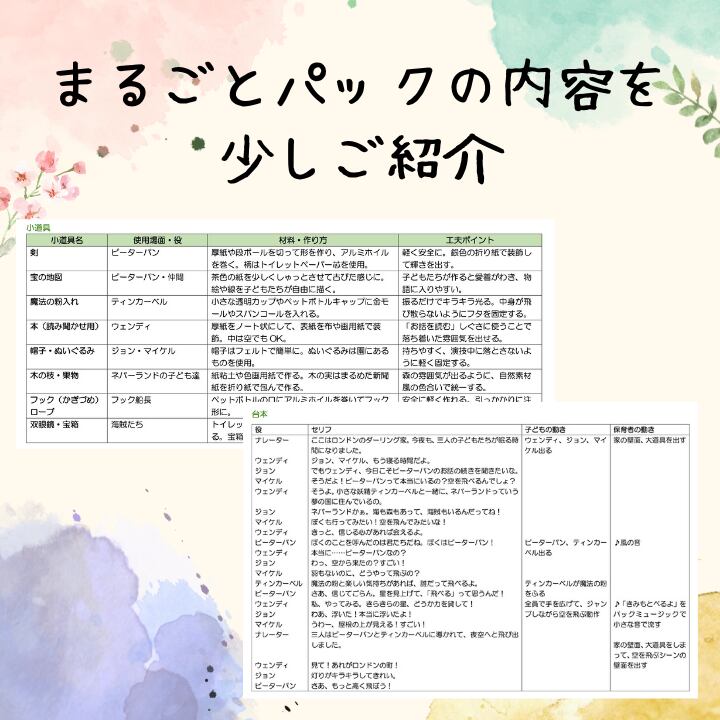 この【発表会「ピーターパン」まるごとパック】PDFでは、4歳児、5歳児クラス向けにピーターパンの発表会がすぐにできる内容をまとめています。