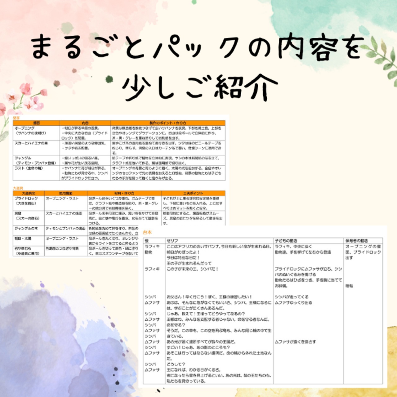 この【発表会「ライオンキング」まるごとパック】PDFでは、5歳児クラス向けにライオンキングの発表会がすぐにできる内容をまとめています。
