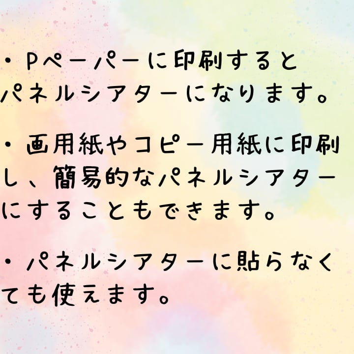 ・画用紙やコピー用紙に印刷し、裏を強くやすりがけ(紙の繊維が立つくらい)すると、パネルシアターのボードにくっつき、簡易的なパネルシアターになります。
