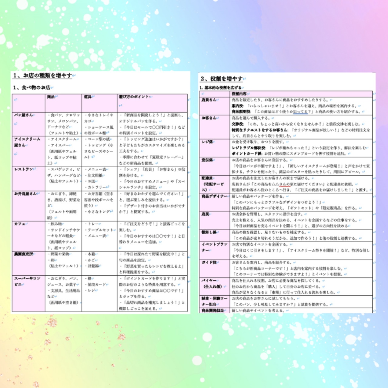 ・教育的要素や科学・アートを取り入れた遊びに!→ お店やさんごっこを通じて、子どもたちが自然に学びを楽しめる方法を提案。遊びながら学べる、教育的な要素が豊富です。